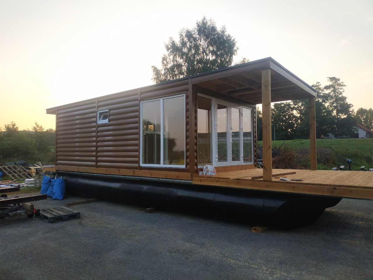 Это наш третий дом на воде, который мы сделали из СИП-панелей. Его заказал владелец яхт-клуба в городе Бремен, в Германии. Этот дом будет сдаваться в аренду людям, которые хотят порыбачить или попутешествовать. Дом выполнен из СИП-панелей. Он установлен на платформу из понтонов. У этого дома есть две террасы: одна на крыше, вторая впереди. На них вы можете рыбачить или загорать. Внутри в доме есть всё необходимое для отдыха - спальня, туалет, душевая, кухня-студия.